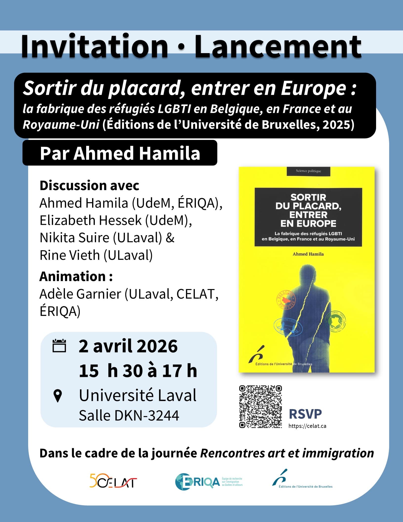 15 h 30 : Lancement de l’ouvrage d’Ahmed Hamila Sortir du placard, entrer en Europe. La fabrique des réfugiés LGBTI en Belgique, en France et au Royaume-Uni (Éditions de l’Université de Bruxelles, 2025), organisé par le CELAT et l’ÉRIQA
