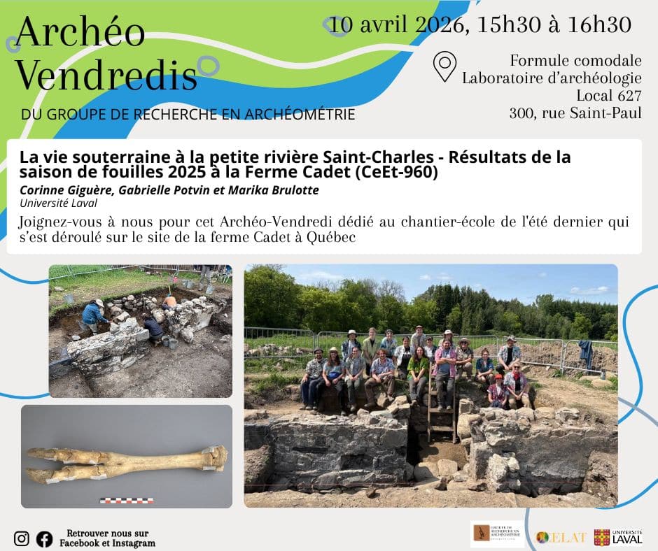 Le prochain Archéo-vendredi du Groupe de recherche en archéométrie se déroulera ce vendredi 10 avril, de 15 h 30 à 16 h 30, au local 627 des Laboratoires d’archéologie de l’Université Laval et sur Zoom.