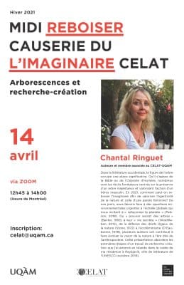 À l’occasion d’un midi-causerie du CELAT-UQAM, Chantal Ringuet, auteure et membre associée du CELAT, présentera la conférence « Reboiser l’imaginaire. Arborescences et recherche-création ». L’activité se tiendra le 14 avril, de 12h45 à 14h, sur Zoom. Inscription : celat@uqam.ca. Résumé : […]