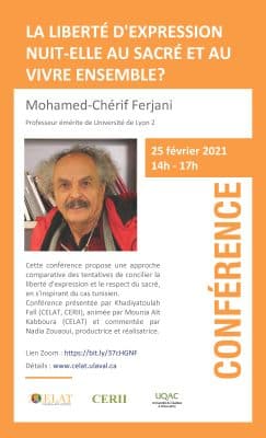 Conférence de Mohamed-Chérif Ferjani, politologue et professeur émérite de l’Université de Lyon 2, Président du Haut-Conseil de Timbuktu Institute African Center for Peace Studies. Jeudi 25 février 2021 de 14h à 17h. Lien Zoom : https://us02web.zoom.us/j/82556879591?pwd=Mk1mUk5qSURGbTl2UUlOMWhZZitrdz09 Résumé de la conférence […]