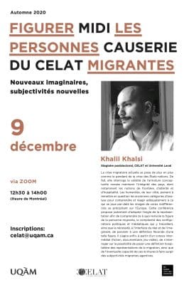 Le CELAT-UQAM est heureux de recevoir le stagiaire postdoctoral Khalil Khalsi pour une causerie intitulée Figurer les personnes migrantes. Nouveaux imaginaires, subjectivités nouvelles Le mercredi 9 décembre 2020, de 12h30 à 14h. En ligne via Zoom. Inscriptions : celat@uqam.ca Résumé […]