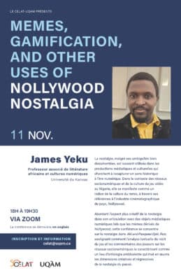 Le CELAT-UQAM vous invite à assister à une conférence internationale présentée par James Yékú, professeur associé de littérature africaine et cultures numériques à l’Université du Kansas. Intitulée « Memes, Gamification and Other Uses of Nollywood Nostalgia », la présentation se […]