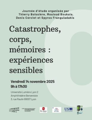 Thierry Boissière, Mouloud Boukala (CELAT), Denis Cerclet et Spyros Franguiadakis organisent la journée d’étude Catastrophes, corps, mémoires : expériences sensibles, qui se déroulera le vendredi 14 novembre, de 9 h à 17 h 30, à l’Université Lumière Lyon 2 (amphithéâtre Benveniste […]