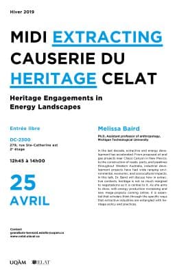 Le CELAT-UQAM et la Chaire de recherche en patrimoine urbain vous invite à rencontrer l’anthropologue Melissa Baird lors de cette causerie intitulée « Extracting Heritage. Heritage Engagements in Energy Landscapes », qui portera sur les enjeux patrimoniaux liés au développement des industries […]