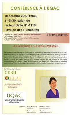 Le jeudi 19 octobre 2017, le CELAT à l’UQAC accueillera Deirdre Meintel, professeure titulaire au département d’anthropologie de l’Université de Montréal et directrice du Centre d’études ethniques des universités montréalaises (CEETUM). Mme Meintel présentera une conférence intitulée « Les religions et […]
