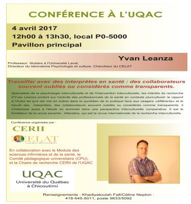 Le mardi 4 avril 2017, le CELAT à l’UQAC acceuille Yvan Leanza, membre du CELAT pour une conférence intitulée » Travailler avec des interprètes en santé : des collaborateurs souvent oubliés ou considérés comme transparents ». La rencontre, organisée en partenariat […]