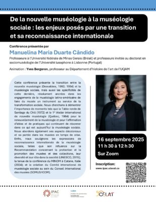 Nous vous invitons chaleureusement à assister à la conférence « De la nouvelle muséologie à la muséologie sociale : les enjeux posés par une transition et sa reconnaissance internationale », qui sera présentée sur Zoom le mardi 16 septembre 2025, de 11 h 30 à 12 h 30, par Manuelina […]