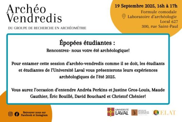 Le Groupe de recherche en archéométrie vous invite au premier Archéo-vendredi du trimestre, consacré aux épopées étudiantes, ce vendredi 19 septembre à 16 h aux Laboratoires d’archéologie de l’UL (salle 627) et sur Zoom. Venez entendre Andréa Perkins et Justine […]