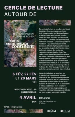 Le CELAT-UQAM vous invite à participer ce trimestre à un cercle de lecture portant sur le livre Nous sommes un continent (Éditions Triptyque, 2021) de Karine Rosso et Nicholas Dawson et quelques textes choisis de Gloria Anzaldúa. Ce projet est une initiative […]