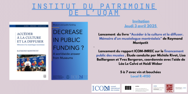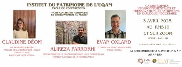 À la suite de la rencontre « Catastrophes environnementales et préservation du patrimoine, un dialogue nécessaire », l’Institut du patrimoine de l’UQAM vous convie, ce jeudi 3 avril dès 17 h à l’UQAM (local R-4150), à un cinq à sept soulignant le lancement […]