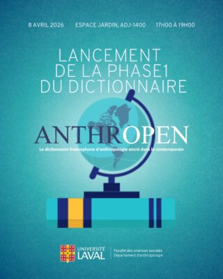 Vous êtes invité-es au lancement de la phase 1 d’Anthropen, un dictionnaire scientifique en ligne consacré à l’anthropologie et aux sciences de la culture, fondé par Francine Saillant (CELAT) et Mondher Kilani et dirigé par Ève Dubé. Le lancement se […]