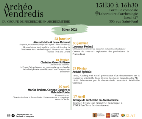 Le Groupe de recherche en archéométrie vous propose cet hiver plusieurs belles conférences le vendredi dès 15 h 30 au local 627 des Laboratoires d’archéologie (300, rue Saint-Paul) et sur Zoom. Pour tous les détails, suivez la page Facebook du groupe.