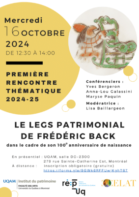 L’Institut du patrimoine de l’UQAM, le RéPUQ et le CELAT vous convient à quatre rencontres thématiques sur « Le legs patrimonial de Frédéric Back » à l’occasion du 100e anniversaire de sa naissance. Une première rencontre, prévue le mercredi 16 […]