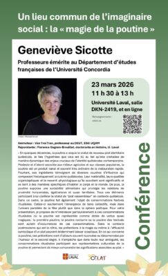 Le CELAT a le plaisir d’accueillir Geneviève Sicotte, professeure émérite à l’Université Concordia, pour une conférence intitulée « Un lieu commun de l’imaginaire social : la “magie de la poutine” », le lundi 23 mars, de 11 h 30 à […]