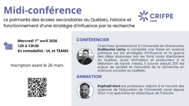 Le CRIFPE vous convie au midi-conférence « Le palmarès des écoles secondaires du Québec : histoire et fonctionnement d’une stratégie d’influence par la recherche », présenté par Guillaume Lamy, chercheur postdoctoral à l’Université de Sherbrooke, le mercredi 1er avril 2026, […]