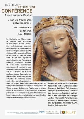 En partenariat avec le CELAT, l’Institut du patrimoine de l’UQAM vous invite à assister à la conférence « Sur les traces des polychromies » que présentera notre membre étudiante Laurence Pauliac (UQAM, Université Paris Nanterre) le vendredi 23 février 2024, […]