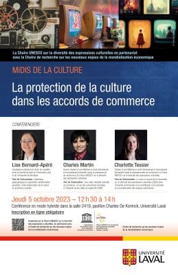 En partenariat avec la Chaire de recherche sur les nouveaux enjeux de la mondialisation économique, la Chaire UNESCO sur la diversité des expressions culturelles, dirigée par notre membre Véronique Guèvremont, accueille Lise Bernard, Charles Martin et Charlotte Tessier le jeudi […]