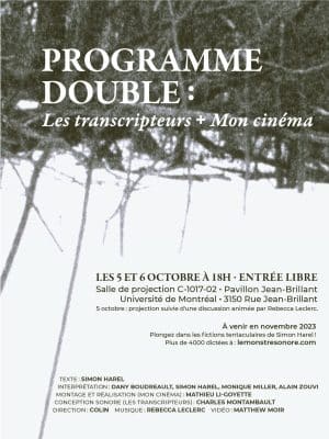 Vous êtes convié-es à une double projection alliant théâtre et cinéma les 5 et 6 octobre dès 18 h à l’Université de Montréal (pavillon Jean-Brillant, salle de projection C-1017-02). Vous aurez l’occasion de découvrir les oeuvres de création Les transcripteurs […]