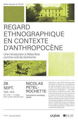 Les membres étudiant-es du CELAT-UQAM sont invité-es à participer à l’atelier « Regard ethnographique en contexte d’Anthropocène : une introduction à l’Atlas féral comme outil de recherche », organisé par Nicolas Petel-Rochette, doctorant en sociologie, dans le cadre de sa […]
