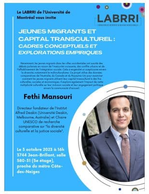 Le LABRRI vous convie à une conférence de Fethi Mansouri (Université Deakin, Melbourne, Australie) intitulée « Jeunes migrants et capital transculturel : cadres conceptuels et explorations empiriques » le mardi 3 octobre 2023, à 16 h, à l’Université de Montréal (3744, rue Jean-Brillant, […]