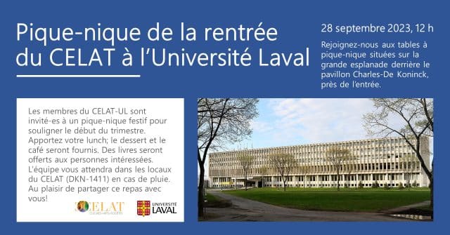 Les membres du CELAT-UL sont invité-es à un pique-nique festif pour souligner le début du trimestre le jeudi 28 septembre dès midi. Rejoignez-nous aux tables à pique-nique situées sur la grande esplanade derrière le pavillon Charles-De Koninck, près de l’entrée. Apportez […]
