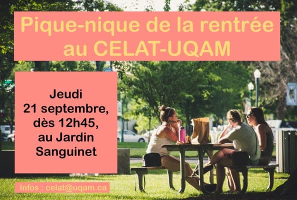Les membres du CELAT-UQAM sont invité-es à un pique-nique de la rentrée le jeudi 21 septembre 2023, de 12 h 45 à 14 h, au jardin Sanguinet, situé dans la cour intérieure faisant face au pavillon de Design, sur la […]