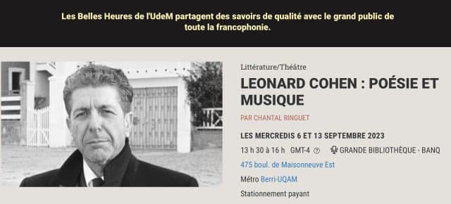Dans le cadre des Belles Heures de l’UdeM, Chantal Ringuet (CELAT) présente une conférence en deux temps sur Leonard Cohen. Les présentations sont prévues les mercredis 6 et 13 septembre 2023 à 13 h 30 à la Grande Bibliothèque. Achat de bille […]