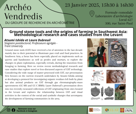 Le Groupe de recherche en archéométrie vous invite à assister au premier Archéo-vendredi du trimestre le 23 janvier à 15 h 30 au local 627 des Laboratoires d’archéologie de l’Université Laval et sur Zoom. Atsumi Ishida et Laure Dubreuil, respectivement […]