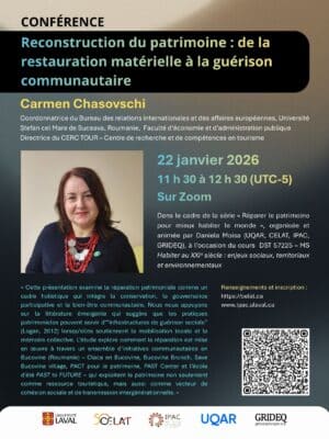 L’IPAC, le CELAT et le GRIDEQ ont le plaisir de vous inviter à la conférence « Reconstruction du patrimoine : de la restauration matérielle à la guérison communautaire » qui sera présentée en anglais par Carmen Chasovschi (Université Ștefan cel Mare […]