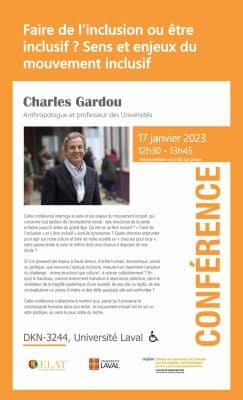 Le CELAT-UQAM est fier d’accueillir Charles Gardou, anthropologue et professeur des universités en France, qui a consacré ses travaux aux vulnérabilités et à leurs multiples expressions. Il offrira une conférence intitulée « Faire de l’inclusion ou être inclusif? Sens et […]
