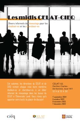 Au trimestre d’automne, le directeur du CELAT, Jean-François Gauvin, et la directrice du Centre interuniversitaire d’études québécoises (CIEQ), Anne Klein, invitent chaque mois leurs membres étudiant-es et chercheur-es à un dîner informel de réseautage dans les locaux du CELAT à […]