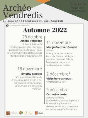 Dans le cadre des Archéo-vendredis, le Groupe de recherche en archéométrie vous propose cet automne plusieurs belles activités en formule comodale le vendredi, de 15 h 30 à 16 h 30, dans la salle DNK-2159 et sur Zoom. Le 28 octobre, Amélie Vallerand (Université […]
