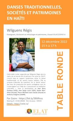 Le CELAT vous invite à la table ronde « Danses traditionnelles, sociétés et patrimoines en Haïti », qui se tiendra en ligne le lundi 12 décembre 2022, de 15 h à 17 h. Cette activité, organisée par notre membre étudiant Wilguens Régis dans le […]