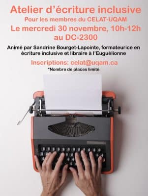 Un atelier portant sur l’écriture inclusive, animé par Sandrine Bourget-Lapointe, formateurice, conseiller-ère en écriture inclusive et libraire à l’Euguélionne, se tiendra le mercredi 30 novembre 2022, de 10 h à 12 h, au CELAT-UQAM (pavillon du Faubourg, salle DC-2300). L’activité […]