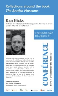 Dan Hicks (University of Oxford, Pitt Rivers Museum) prononcera en anglais une conférence autour de son remarquable ouvrage The Brutish Museums (Pluto Press, 2020) le lundi 7 novembre à 11 h 30 (UTC-5), dans le cadre de la série « Décoloniser les musées », […]