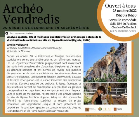 Ce vendredi 28 octobre dès 15 h 30, Amélie Vallerand (Université de Montréal) présentera la conférence « Analyse spatiale, SIG et méthodes quantitatives en archéologie : étude de la distribution des artéfacts au site de Riparo Bombrini (Ligurie, Italie) » dans le cadre […]