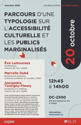 Le CELAT vous convie à la conférence « Parcours d’une typologie sur l’accessibilité culturelle et les publics marginalisés », que présenteront Ève Lamoureux (CELAT-UQAM), Marcelle Dubé (UQAC) et Alexandra Tourigny-Fleury (CELAT-UQAM) le jeudi 20 octobre 2022 à 12 h 45 […]