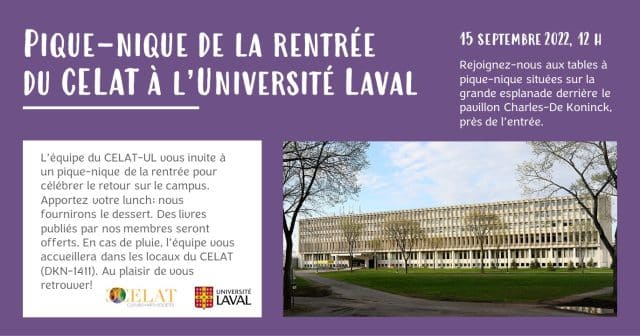 L’équipe du CELAT à l’Université Laval invite ses membres à un pique-nique de la rentrée pour célébrer le retour sur le campus. L’activité se déroulera le jeudi 15 septembre à midi aux tables à pique-nique situées sur la grande esplanade […]