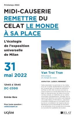 *Consultez la vidéothèque du CELAT pour visionner la conférence. Le CELAT vous convie à un midi-causerie avec l’ethnologue Van Troi Tran sur le thème « Remettre le monde à sa place : l’écologie de l’exposition universelle de Milan ». Animée par Lucie K. […]