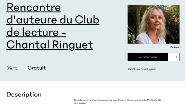 Chantal Ringuet, membre associée du CELAT, discutera avec Danielle Laurin de son ouvrage Alys Robi a été formidable (Québec Amérique, 2021) à la bibliothèque Robert-Lussier de Repentigny le dimanche 29 mai à 14 h. Activité gratuite. Inscription requise. Renseignements :