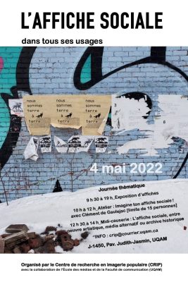 Le Centre de recherche en imagerie populaire (CRIP), actif depuis 1978 et rattaché à l’École des médias, organise, le mercredi 4 mai à l’UQAM (salle J-1450), une journée thématique sur l’affiche sociale dans le but d’en faire découvrir la richesse […]