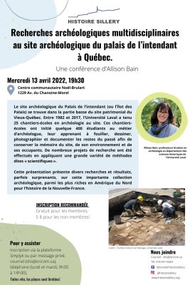 La Société d’histoire de Sillery vous invite à assister à une conférence d’Allison Bain (CELAT) intitulée « Recherches archéologiques multidisciplinaires au site archéologique du palais de l’intendant à Québec » le mercredi 13 avril à 19 h 30 au centre communautaire Noël-Brulart. Places limitées. […]