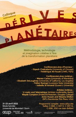 Le Centre de recherche des études littéraires et culturelles sur la planétarité (CELCP) vous invite à assister au colloque international Dérives/Mouvements planétaires : méthodologie, technologie et imagination créative à l’ère de la transformation planétaire, qui se tiendra à l’Université de […]