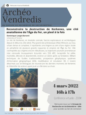 Dans le cadre de la programmation hivernale des Archéo-vendredis, vous êtes convié.e.s à une conférence virtuelle de Dominique Langis-Barsetti intitulée « Reconstruire la destruction de Kerkenes, une cité anatolienne de l’Âge du Fer, un pixel à la fois » ce vendredi 4 mars […]