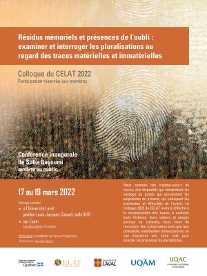 Le CELAT est heureux d’inviter ses membres à son colloque 2022, qui se déroulera du 17 au 19 mars 2022 en formule comodale à l’Université Laval (pavillon Casault, salle 1640) et sur Zoom. Sur le thème Résidus mémoriels et présences […]