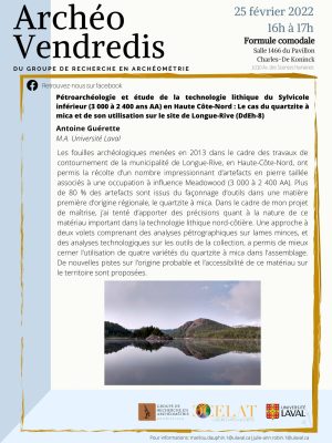 Le Groupe de recherche en archéométrie vous convie, le vendredi 25 février à 16 h, à une conférence comodale d’Antoine Guérette sur la pétroarchéologie et l’étude de la technologie lithique du Sylvicole inférieur. L’activité se déroulera sur Zoom et dans […]