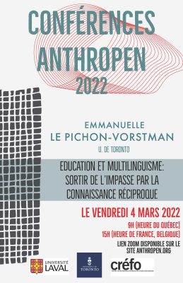 L’équipe de la direction d’Anthropen vous invite à assister, le vendredi 4 mars 2022 à 9 h, à une conférence virtuelle d’Emmanuelle Le Pichon-Vorstman (Université de Toronto, CREFO) intitulée « Éducation et multilinguisme : sortir de l’impasse par la connaissance […]