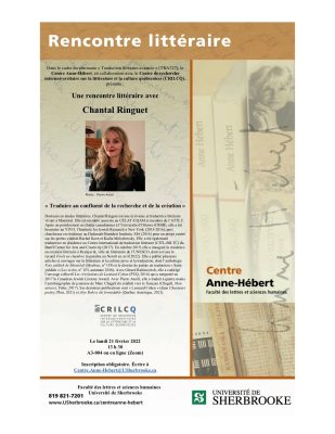 Une rencontre littéraire avec Chantal Ringuet, membre associée du CELAT, est prévue le lundi 21 février, de 13 h 30 à 15 h, dans le cadre du séminaire Traduction littéraire avancée offert par l’Université de Sherbrooke. L’activité, sur le thème […]