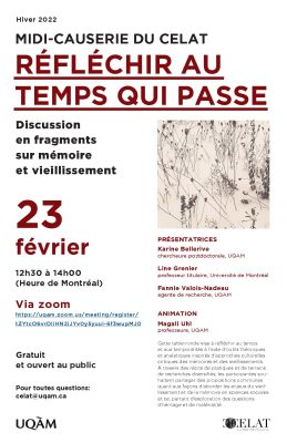 Le CELAT vous invite, le mercredi 23 février, de 12 h 30 à 14 h, à une table ronde virtuelle sur le thème « Réfléchir au temps qui passe ». Animée par Magali Uhl (CELAT), l’activité rassemblera Karine Bellerive, Line Grenier et […]