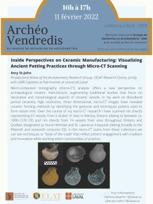 Amy St. John, stagiaire postdoctorale au CELAT sous la direction d’Allison Bain, présentera sur Zoom la conférence « Inside Perspectives on Ceramic Manufacturing: Visualizing Ancient Potting Practices through Micro-CT Scanning » le vendredi 11 février à 16 h. La conférence, en anglais, s’inscrit […]
